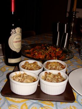 Place ramekins in a 9 x 11 baking pan, and fill with hot water half way up the sides of the ramekins in depth. Bake in the oven for 35 to 40 minutes or until the centre of each custard jiggles slightly. Remove carefully from the pan and place on a baking sheet. To each ramekin, add a handful of croutons and a tablespoon of parmesan cheese. Place the cookie sheet under the broiler to melt cheese or use a kitchen torch to brown the cheese.